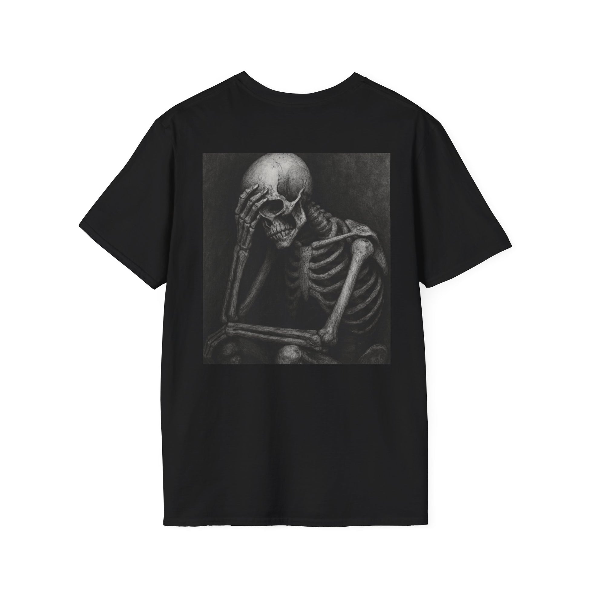 This Sad Skeleton T-Shirt exudes a dark and melancholic vibe, perfect for fans of gothic and Halloween-themed apparel. It is ideal for adults looking to express their unique style during spooky events, Halloween parties, or everyday wear with a touch of darkness.